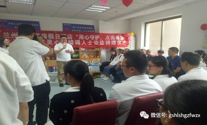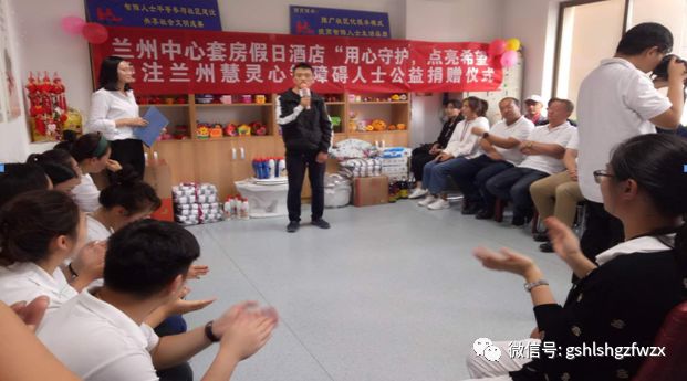 2018.9.6兰州中心套房假日酒店傅总,崔总携员工代表25人一行到兰州慧灵探访机构,做爱心捐赠。本次爱心捐赠仪式共7项。 一、慧灵总干事徐小妹老师介绍机构基本情况; 二、兰州中心套房假日酒店代表傅总,崔总讲;三、热身活动:《金龙拍拍操》; 四、学员节目表演;五、捐赠环节;六、机构回赠奖牌。在热情欢乐的氛围下活动逐项进行,徐老师全面介绍了机构历史背景,运营情形,发展模式,给大家完整呈现了慧灵的悠久历史和慧灵与心智障碍人士之间的渊源,故事。
