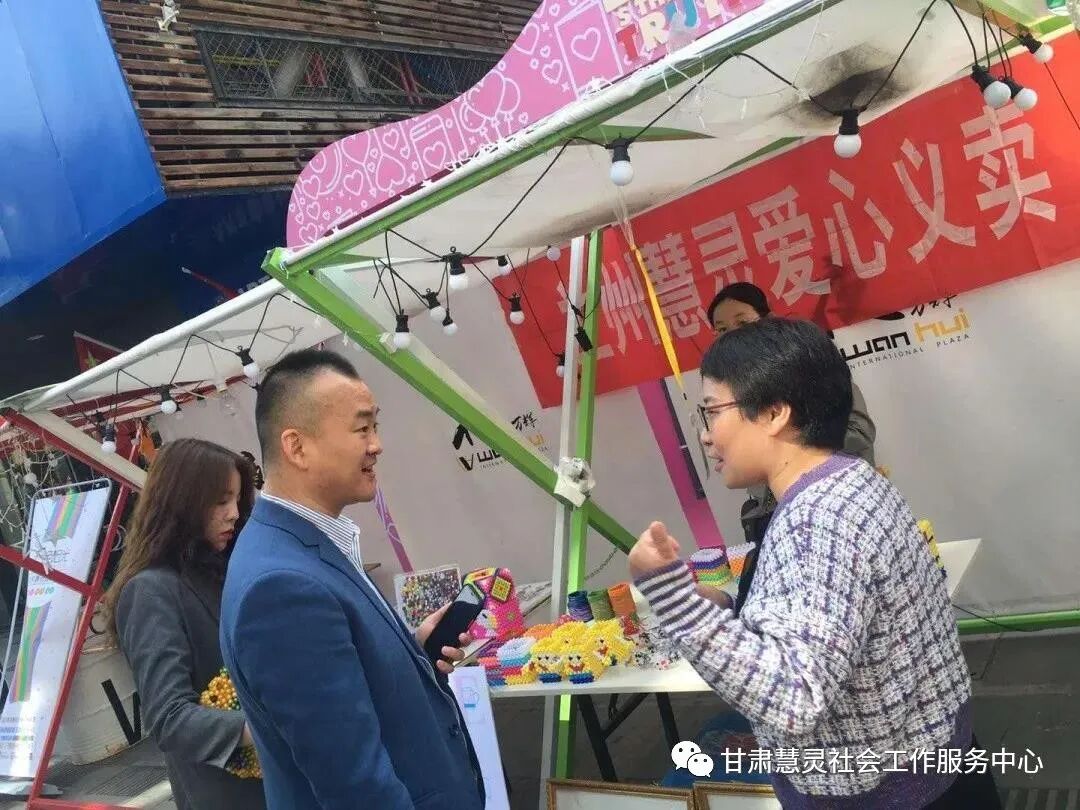 爱心义卖大舞台,奉献精神动起来。在此次活动中万辉国际的领导特意给我们安排了义卖台,兰州慧灵带来了学员们精心准备的纯手工钥匙扣、笔筒、扣子画、自画像等精美作品,为了让我们大家看到这些自闭症儿童的动手能力并能像常人一样优秀,同时也希望身边的广大群体可以支持他们、帮助他们、关注他们,一次购买,一份希望。
