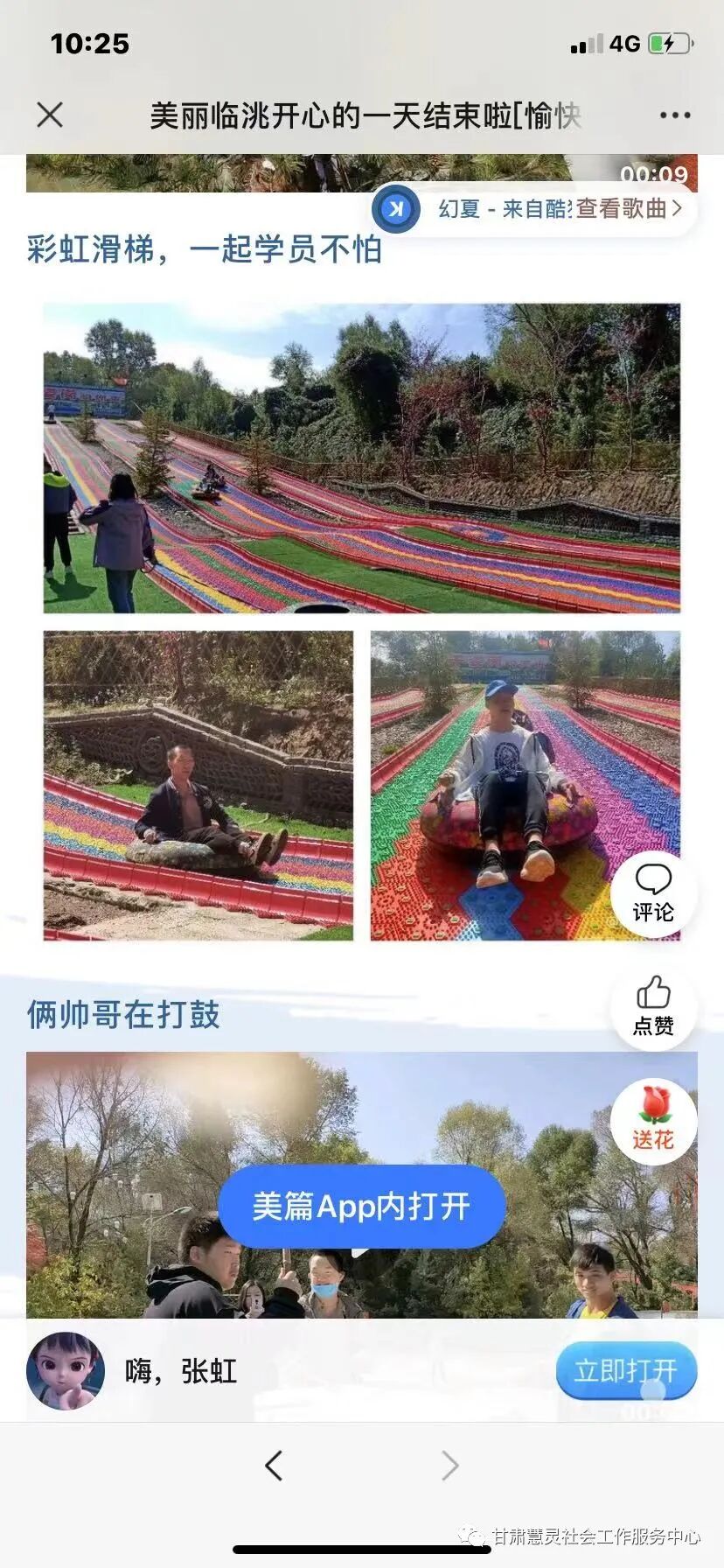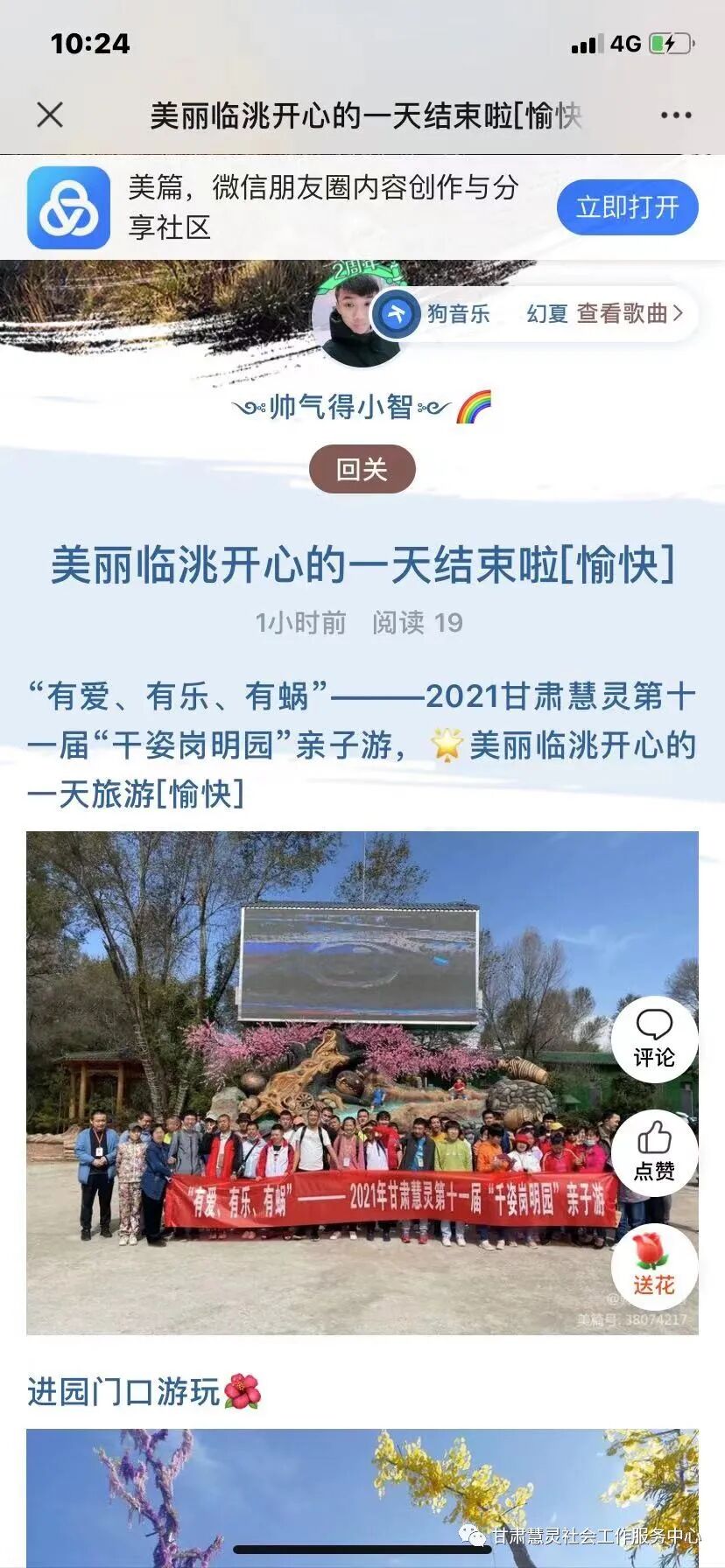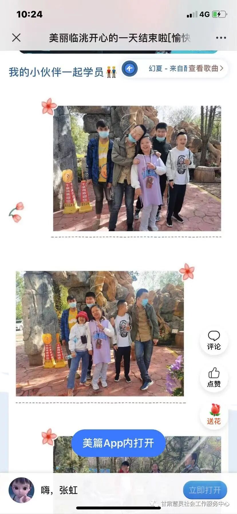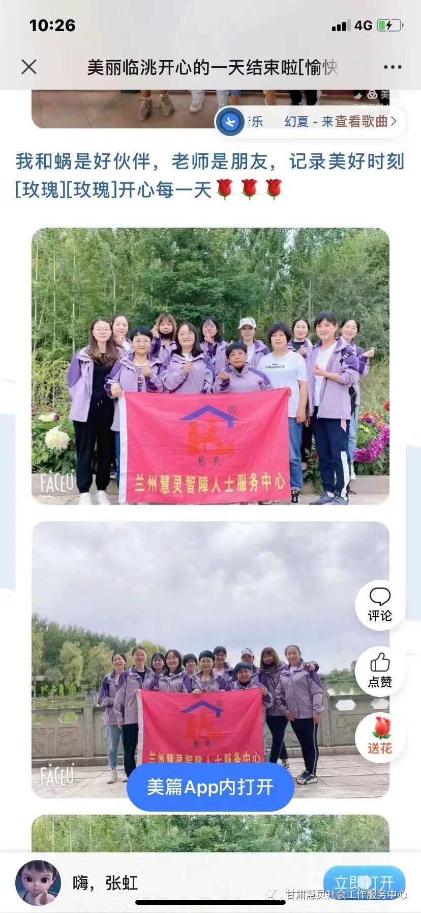 在此小编想分享一位学员“小智”自己制作的美篇,居然动作比小编还快,虽然简单但整体内容有调理、有顺序富有感情。真正表达了心智障碍人士对社会融合活动的需求和活动带来的满足和快乐,这也是甘肃慧灵开展融合活动的目的。 点击 上方文字 关注我们 更多精彩内容 扫码关注我们