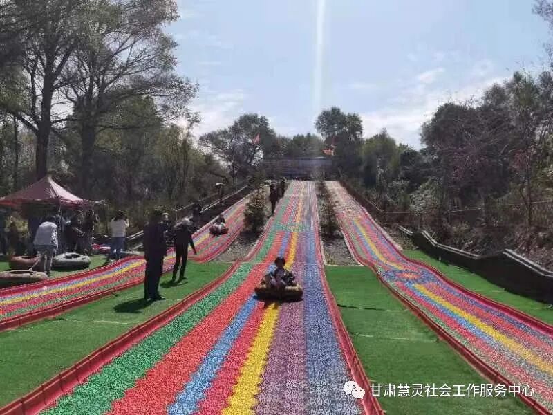 人群中突然传来一声声惊讶声,放眼望去五颜六色的原来是游玩设施彩虹滑道,学员们瞬间变成风中的少年狂奔而去。